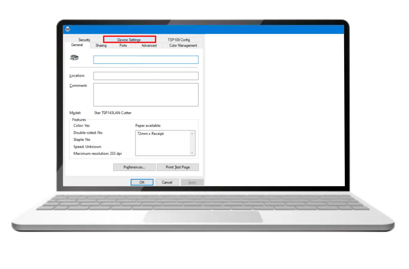 Next, click on the Printer Properties link and a window will open. From here, select the Device Settings tab.