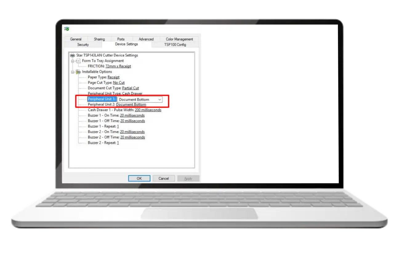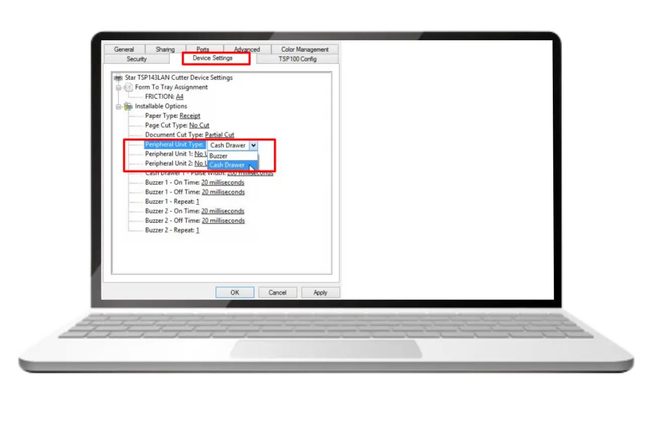 Under Installable Options, find the Peripheral Unit Type and change it to ‘Cash Drawer’.