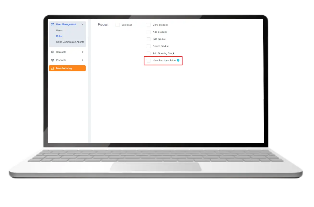 Step 3 : Under the Product Section, you can disable the ‘View Purchase Price’ checkbox. If this is disabled, the user with the particular role can’t see the price while transferring.